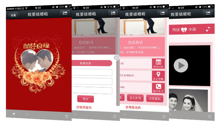 新人可通過微喜帖向親朋好友告知結(jié)婚消息、時(shí)間、地址等,同時(shí)支持微信在線提交赴會消息、婚禮祝福,并可一鍵分享喜帖到自己的朋友圈,幫助婚慶商家進(jìn)行免費(fèi)的品牌推廣。